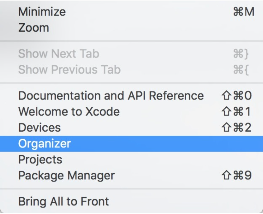 1. 打开 Xcode 顶部菜单栏 > Window > Organizer 窗口。