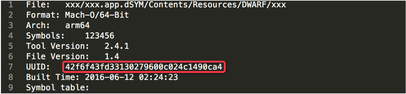 查看符号表文件的 UUID,详情请参见 UUID 提取指引。