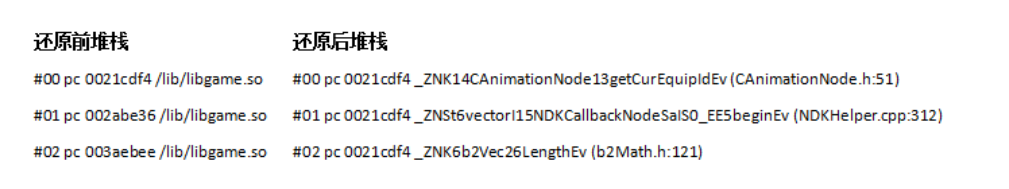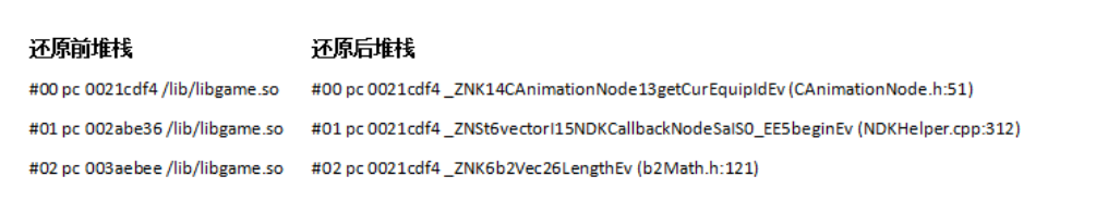 <起始地址> <结束地址> <函数> [<文件名:行号>]。对于 Native Crash,为了能快速并准确地定位用户 App 发生 Crash 的代码位置,平台使用符号表对 App 发生 Crash 的程序堆栈进行解析和还原,例如下图: