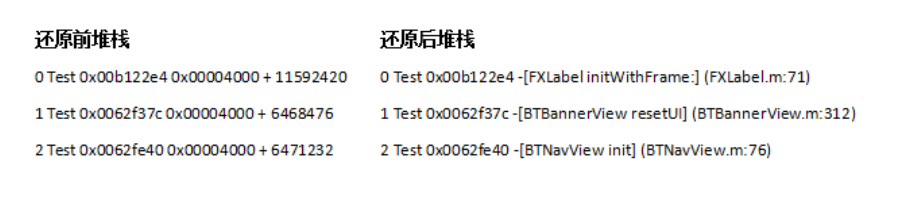 <起始地址> <结束地址> <函数> [<文件名:行号>]。为了能快速并准确地定位用户 App 发生 Crash 的代码位置,平台使用符号表对 App 发生 Crash 的程序堆栈进行解析和还原,例如下图: