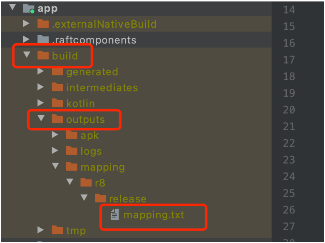 <项目文件夹>/<Module>/build/outputs/mapping/<build-type>/。