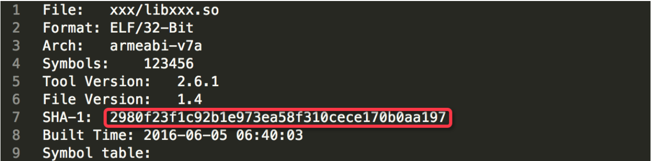其中符号表文件的 “SHA-1” 信息即 Debug SO 文件的 UUID ,亦是符号表文件的 UUID ,如果文件较大,建议使用 “Sublime Text” 等文本编辑器来打开符号表文件。更多说明请参见 UUID 提取指引。