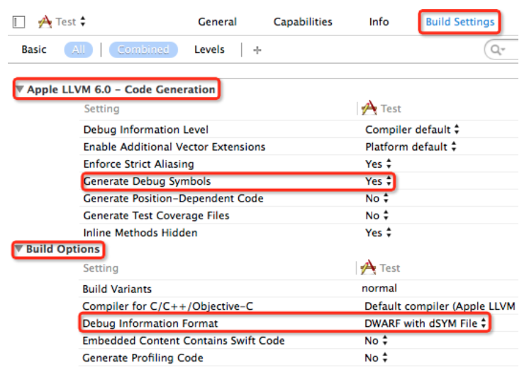 XCode -> Build Settings -> Code Generation -> Generate Debug Symbols -> YesXCode -> Build Settings -> Build Option -> Debug Information Format -> DWARF with dSYM File