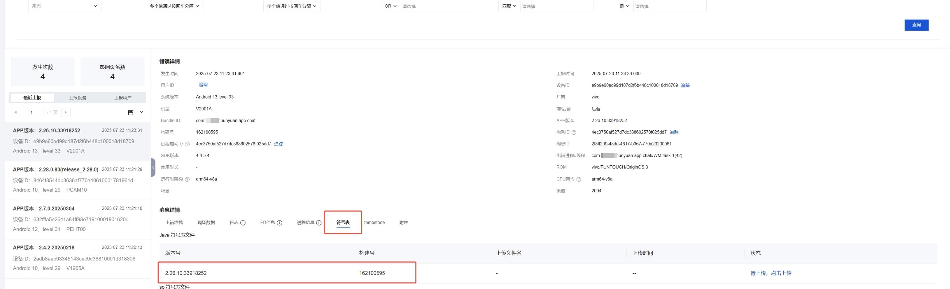 Android 的 mapping 文件通过 App 版本,构建号来进行关联。例如,对于指定异常上例,平台通过 App 版本、构建号来查找匹配的符号表文件。对于指定的 App 版本和构建号,平台支持上传多个符号表文件,通过文件名来区分。