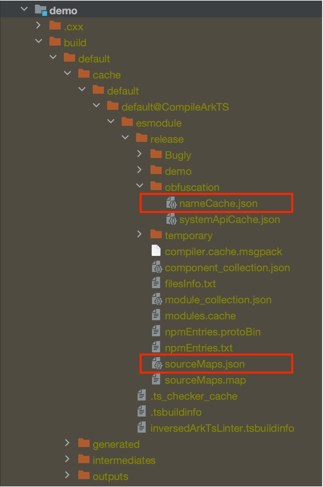 nameCache & SourceMaps 文件:Harmony 的 nameCache & SourceMaps 文件类似 Android 的 mapping:nameCache 文件用于混淆前后 ts/js 符号、变量等名称的前后对应;SourceMaps 文件用于混淆前后 ts/js 的行号对应。