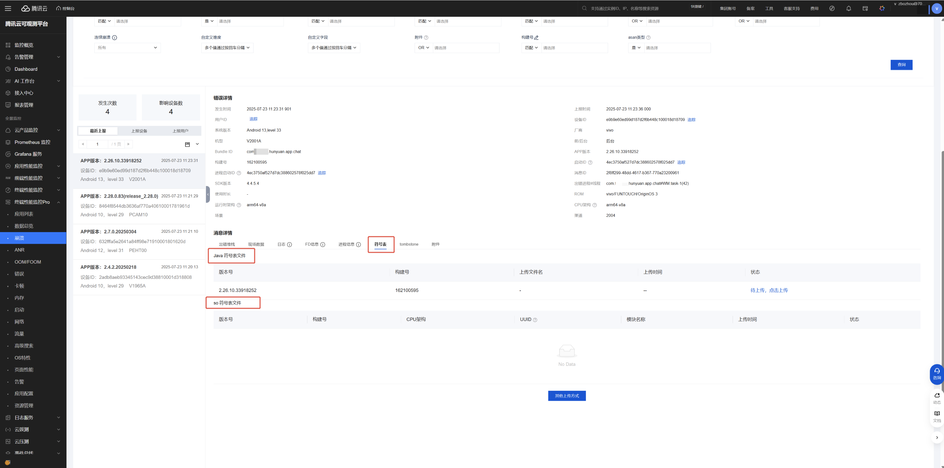 为了方便找回 Crash 对应的 Debug SO 文件和还原堆栈,建议每次构建或者发布 App 版本的时候,备份好 Debug SO 文件,或者借助平台的符号表上传工具,将符号表上传到平台。
