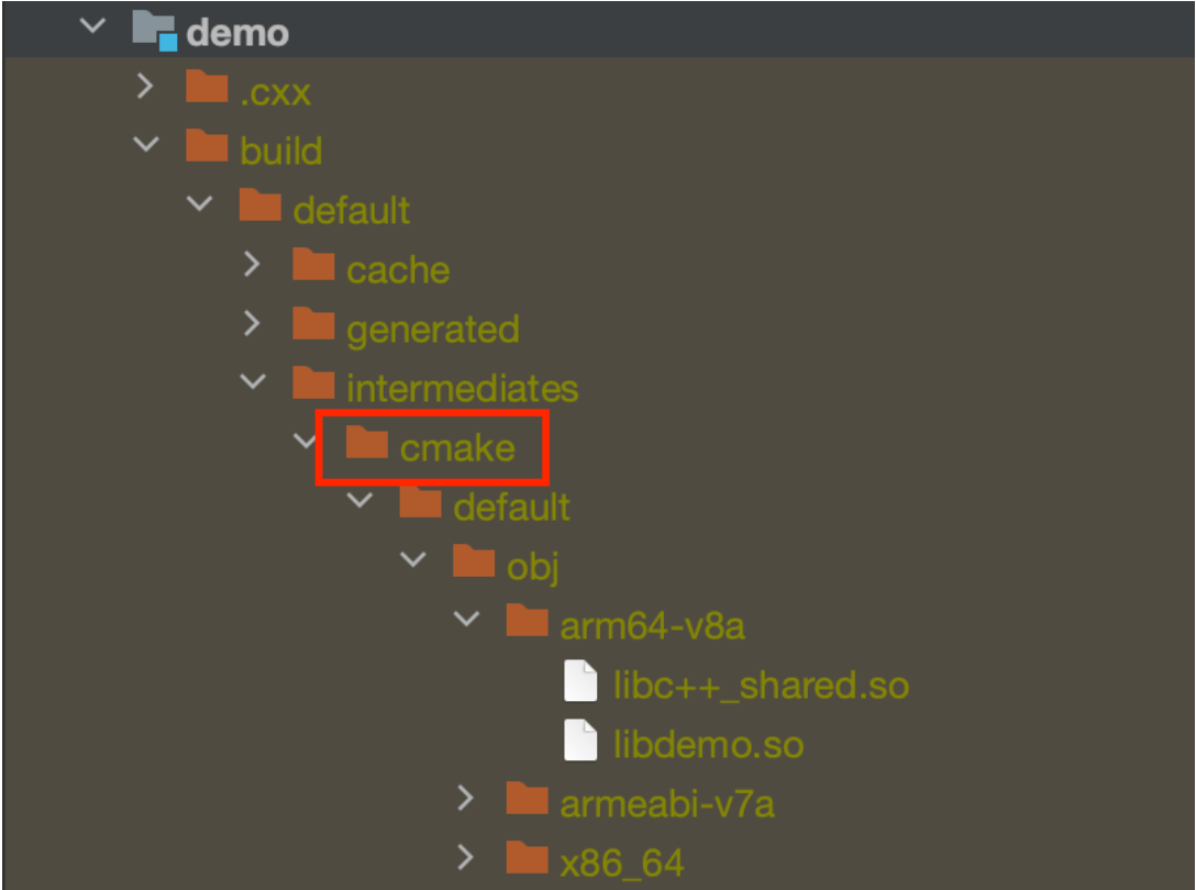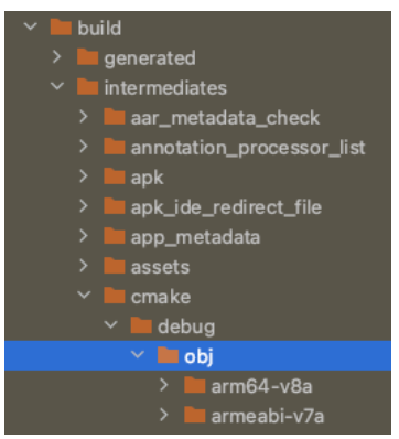 <项目文件夹>/<Module>/build/default/intermediates/cmake/default/obj/<架构>/