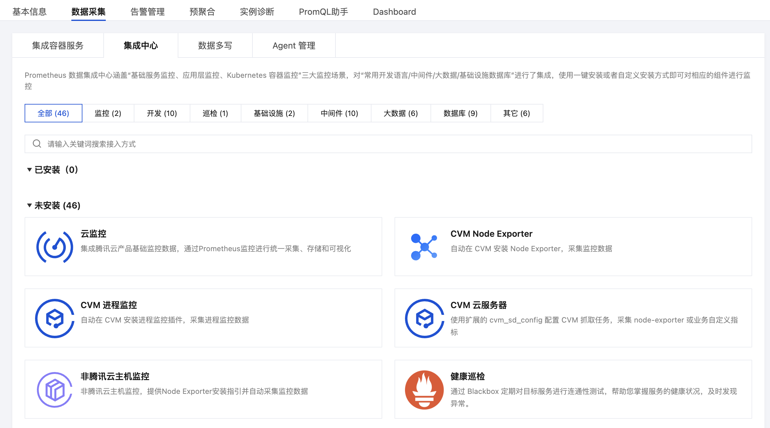 若用户需要集成非容器服务数据源,可直接通过集成中心一键安装集成,操作详情可参见