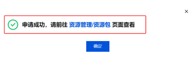3. 确定后会弹出申请成功的页面,单击资源管理/资源包即可前往资源包页面查看已申请的试用套餐。