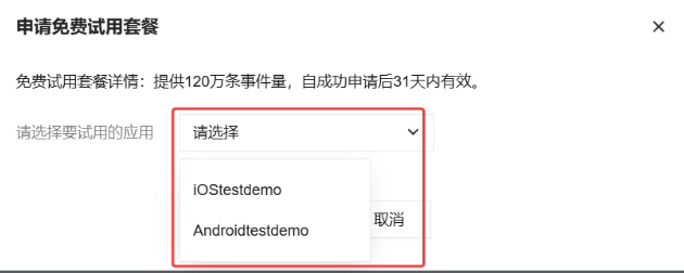 2. 在申请免费试用套餐弹窗中下拉选择要试用的应用,然后单击确定。