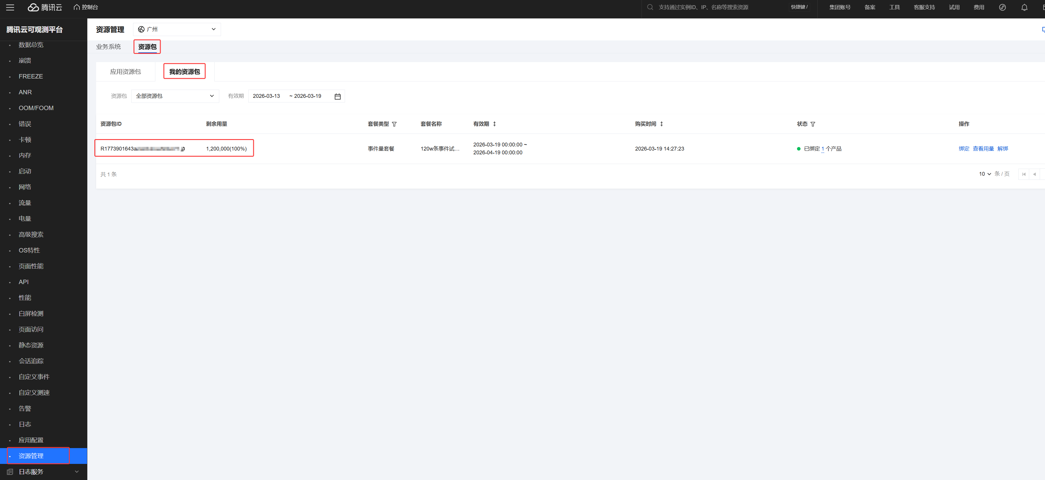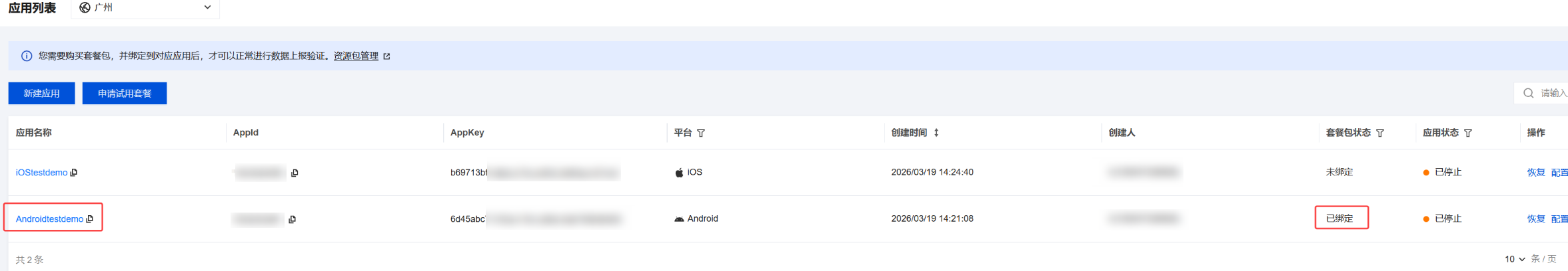 4. 在应用列表中查询到应用的套餐包状态为已绑定,则表示可以正常使用。