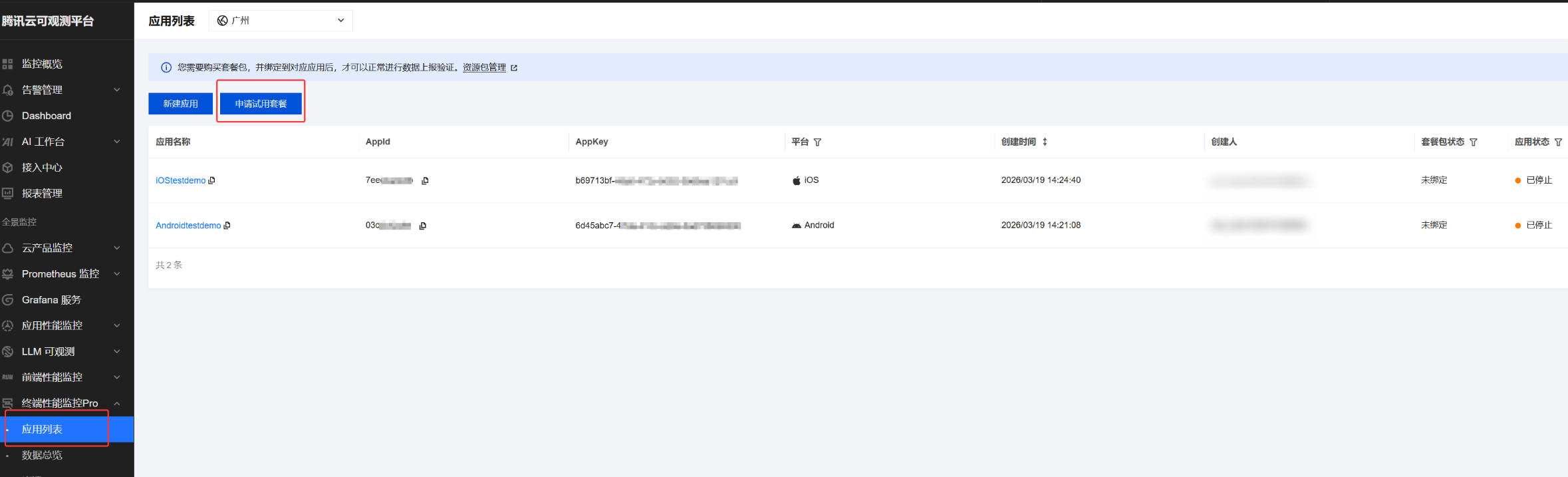 1. 登录 终端性能监控 Pro,在应用列表页面单击申请试用套餐。