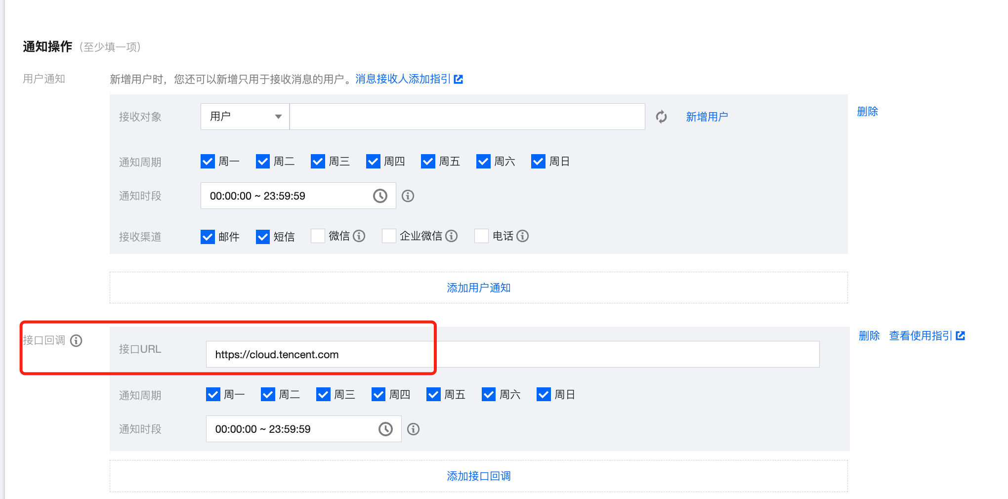 3. 在新建通知模板页配置完基础信息后,在接口回调模块中填写公网可访问到的 URL 作为回调接口地址(例如