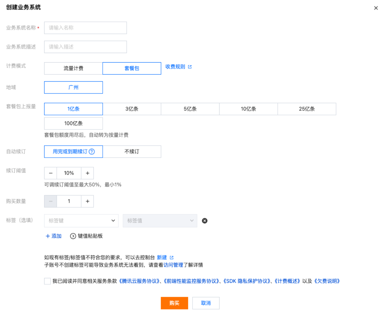 前端性能监控针对不同的上报需求,推出不同价格的套餐包。可以通过购买不同的套餐包抵扣对应业务系统的上报量。相较于按量计费方式,套餐包具有较高的折扣优惠,套餐包目前支持广州上报地域,您可根据需求进行购买。