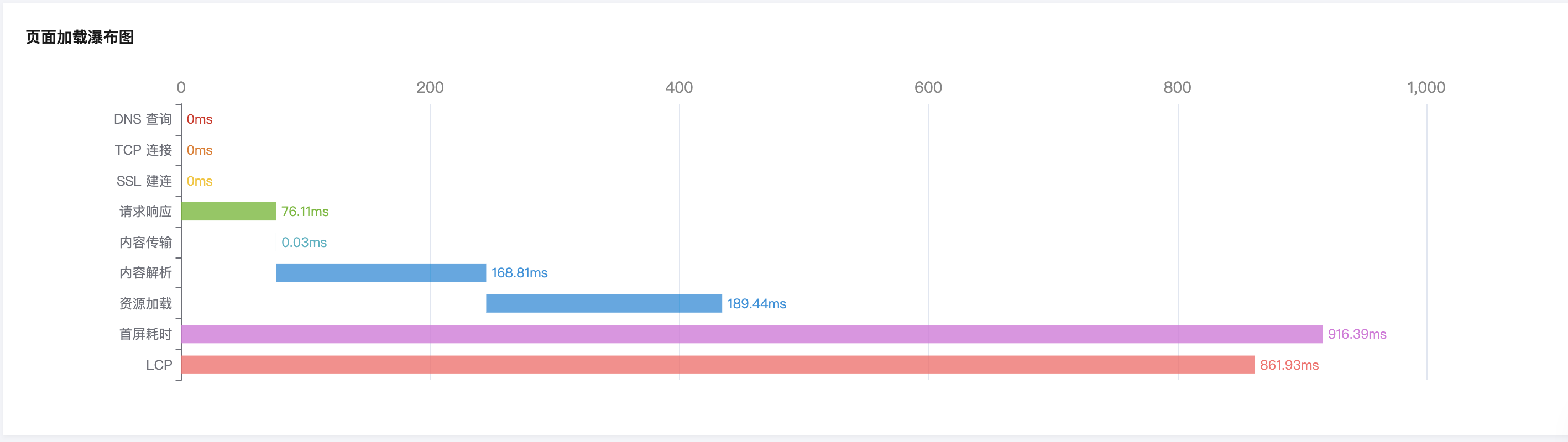 在服务端场景,瀑布图会出现首屏时间大于 DOM 解析的情况,这是由于移动端设备兼容性问题,有些设备无法获取到 DNS 查询、TCP 连接、SSL 建连时间,这三个指标汇总后的平均值偏小,导致除了首屏时间外的其他指标都往左偏移。