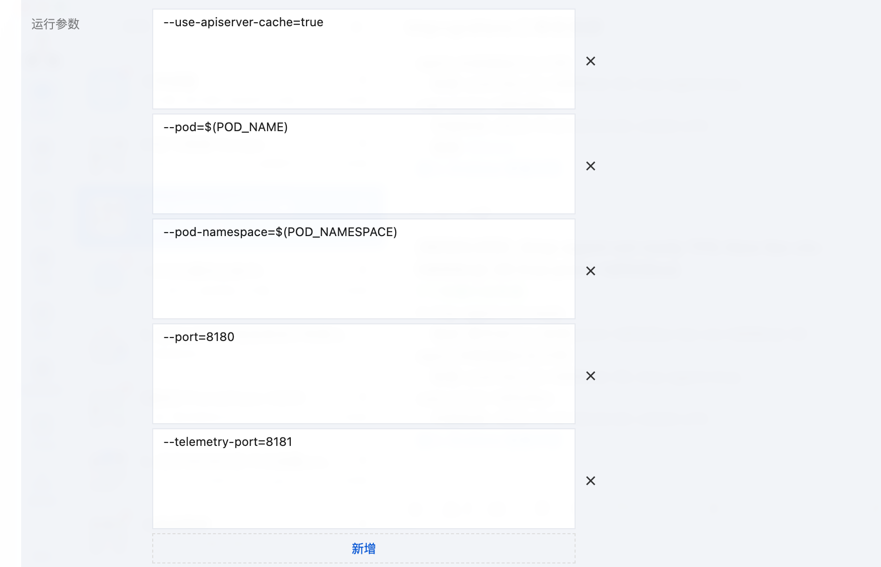 依次单击更新 Pod 配置 > 显示高级配置 > 新增,添加运行参数。