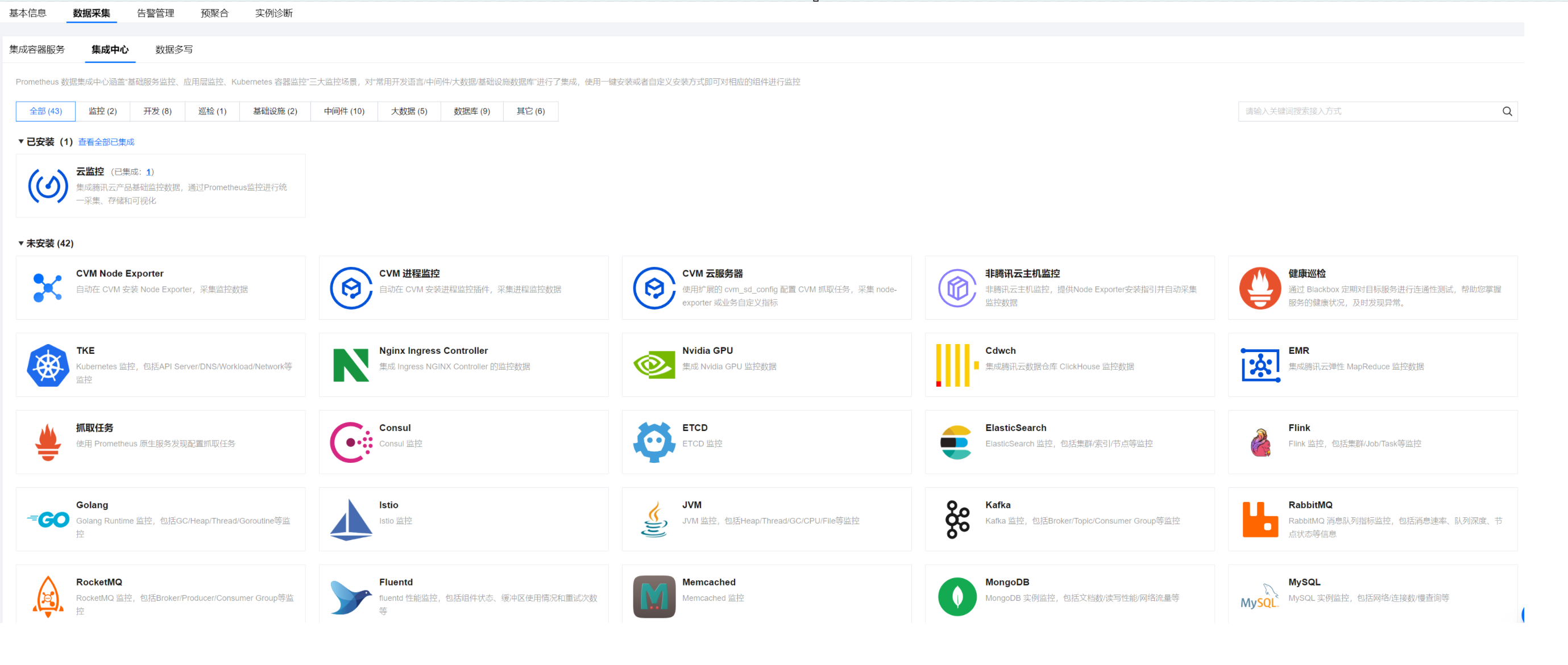 监控/开发/中间件/大数据等组件进行了集成,用户只需根据指引即可对相应的组件进行监控,同时提供了开箱即用的 Grafana 监控大盘。