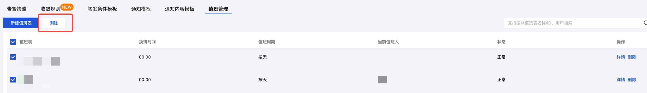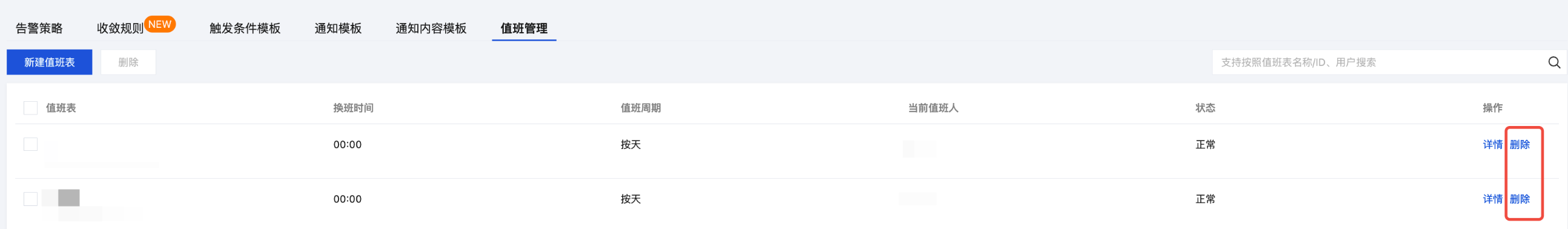 用户可以删除已经创建完成的值班表,值班表删除后,值班表关联的通知模板将不会把通知发送给值班表用户。
