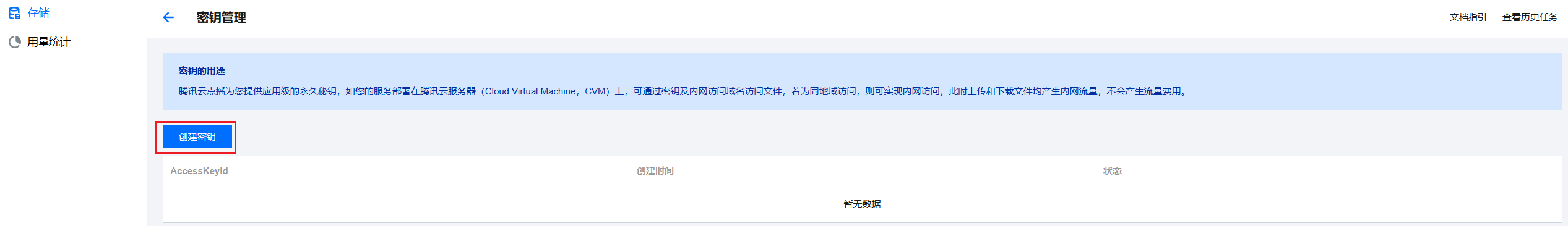4. 在密钥管理页面中,单击创建密钥,确认保存密钥信息即可完成密钥的创建。