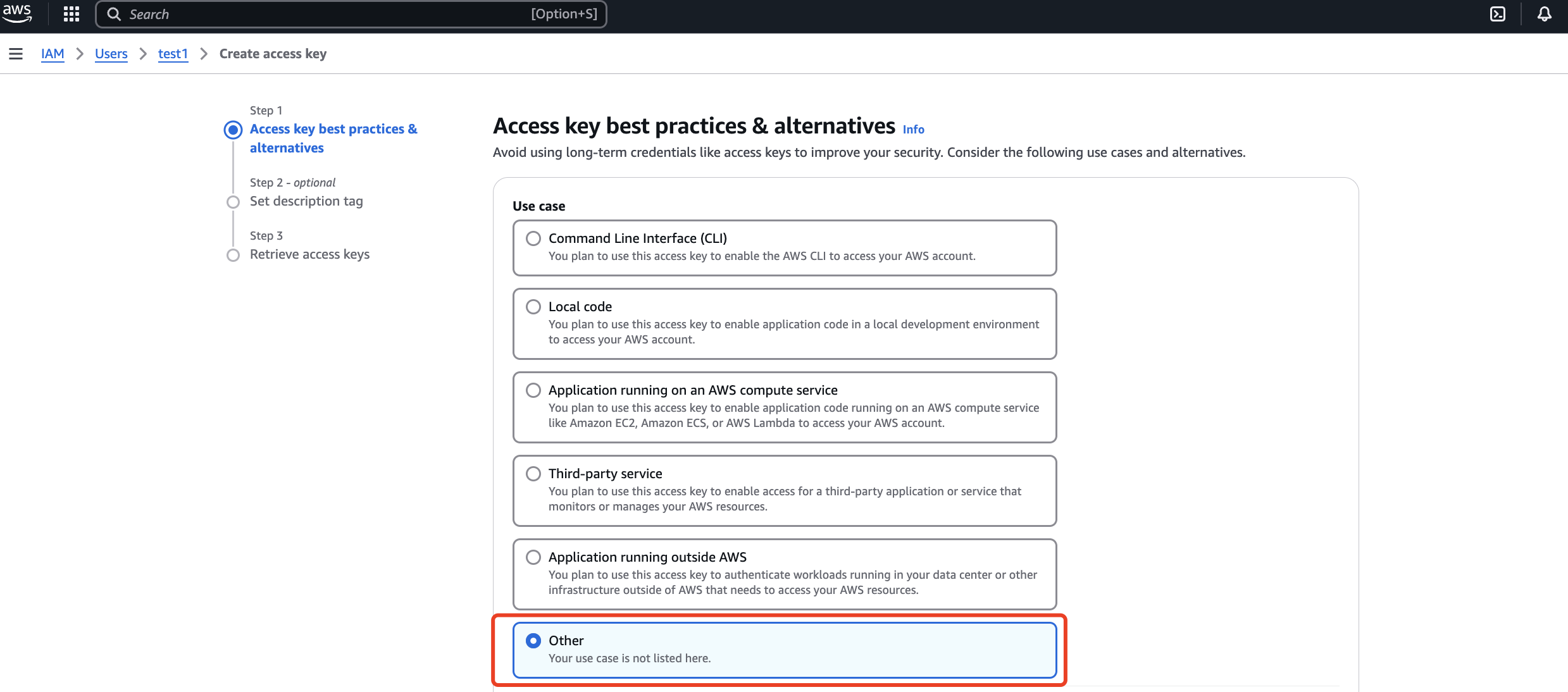 3. 选择 Other,单击 Next 创建。注意保存好 Access key ID 和 Secret access key。