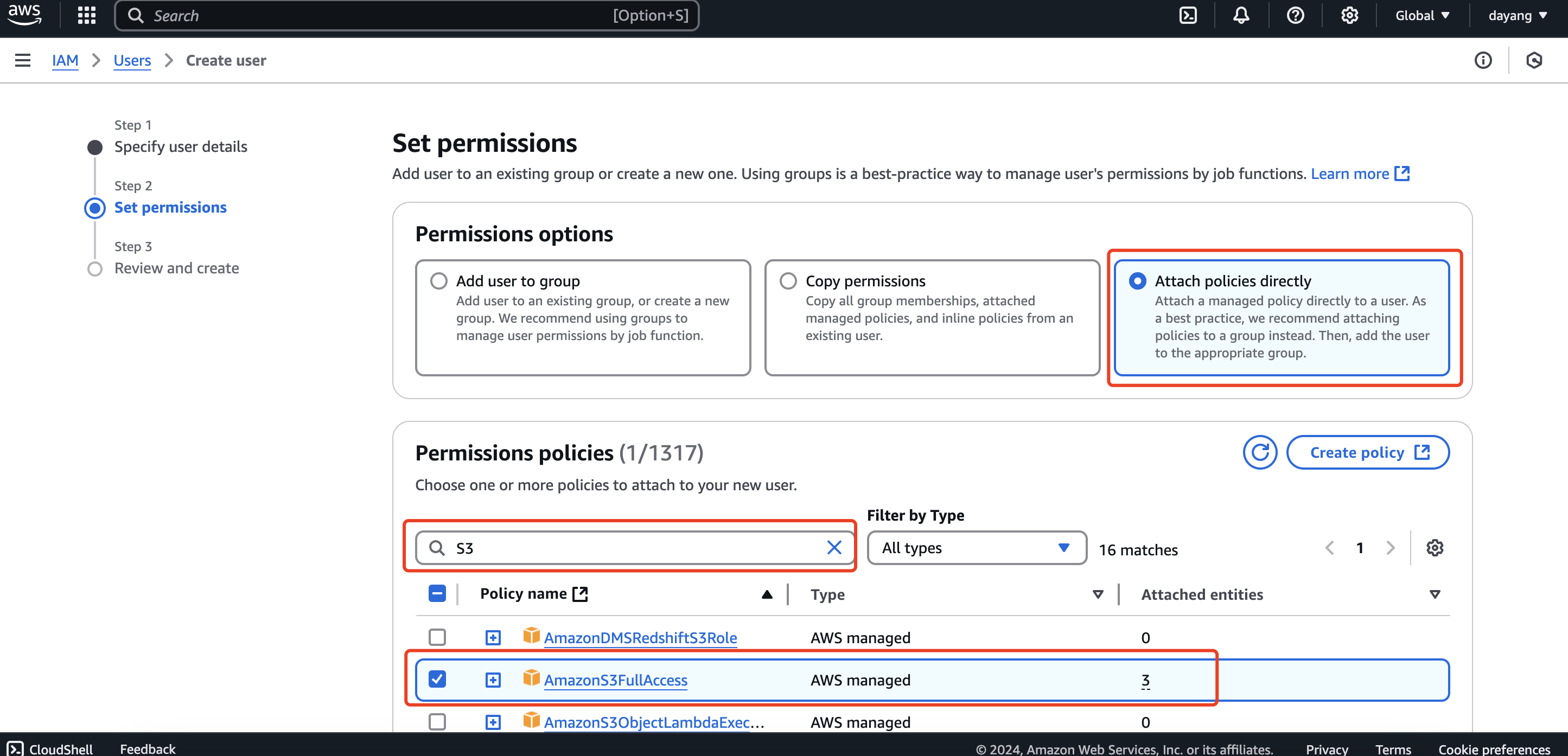 4. 在权限设置页面,单击 Attach policies directly 选项,在搜索栏中输入“S3”,在检索结果中选择 AmazonS3FullAccess 权限,单击 Next 并完成用户的创建。