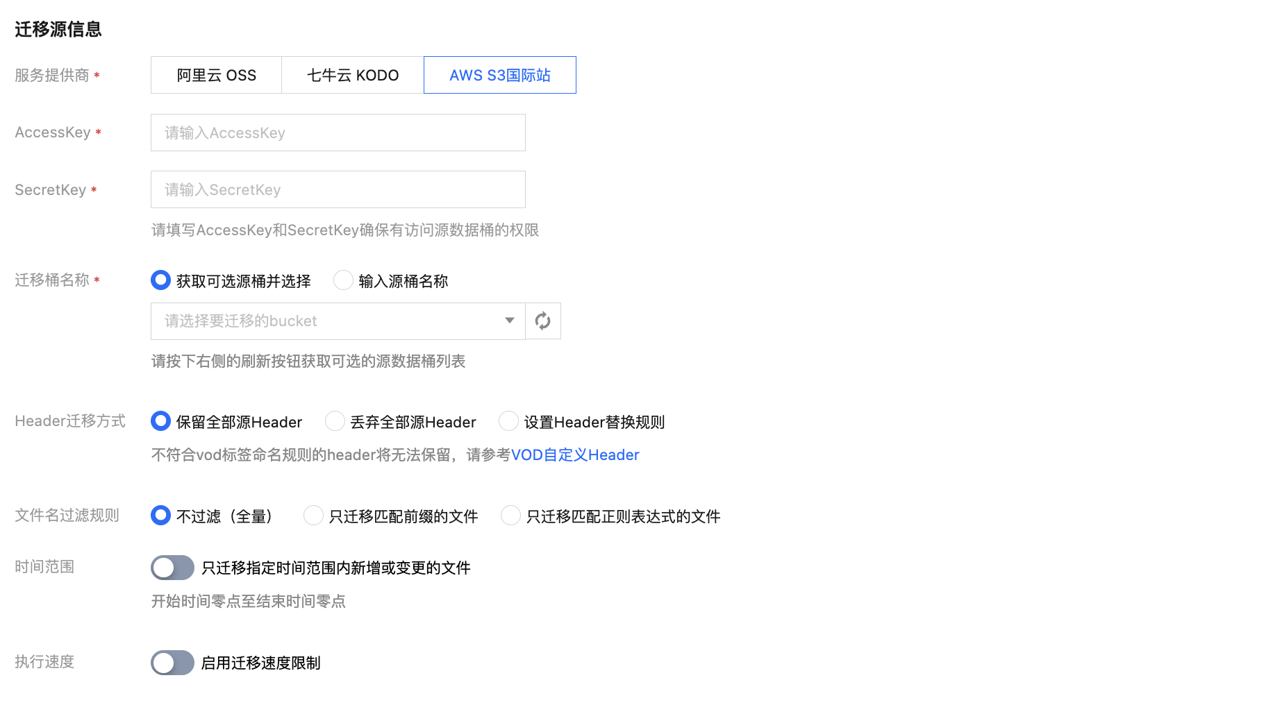 服务提供商:此处迁移源服务提供商应选择 AWS S3。
