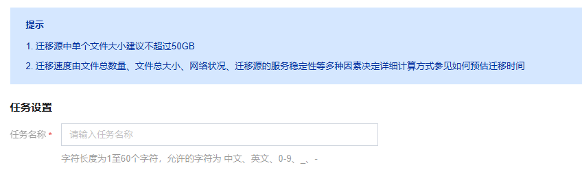 2. 设置迁移任务名称。任务名称长度为1至60个字符,允许的字符为中文、英文、0-9、_、-。