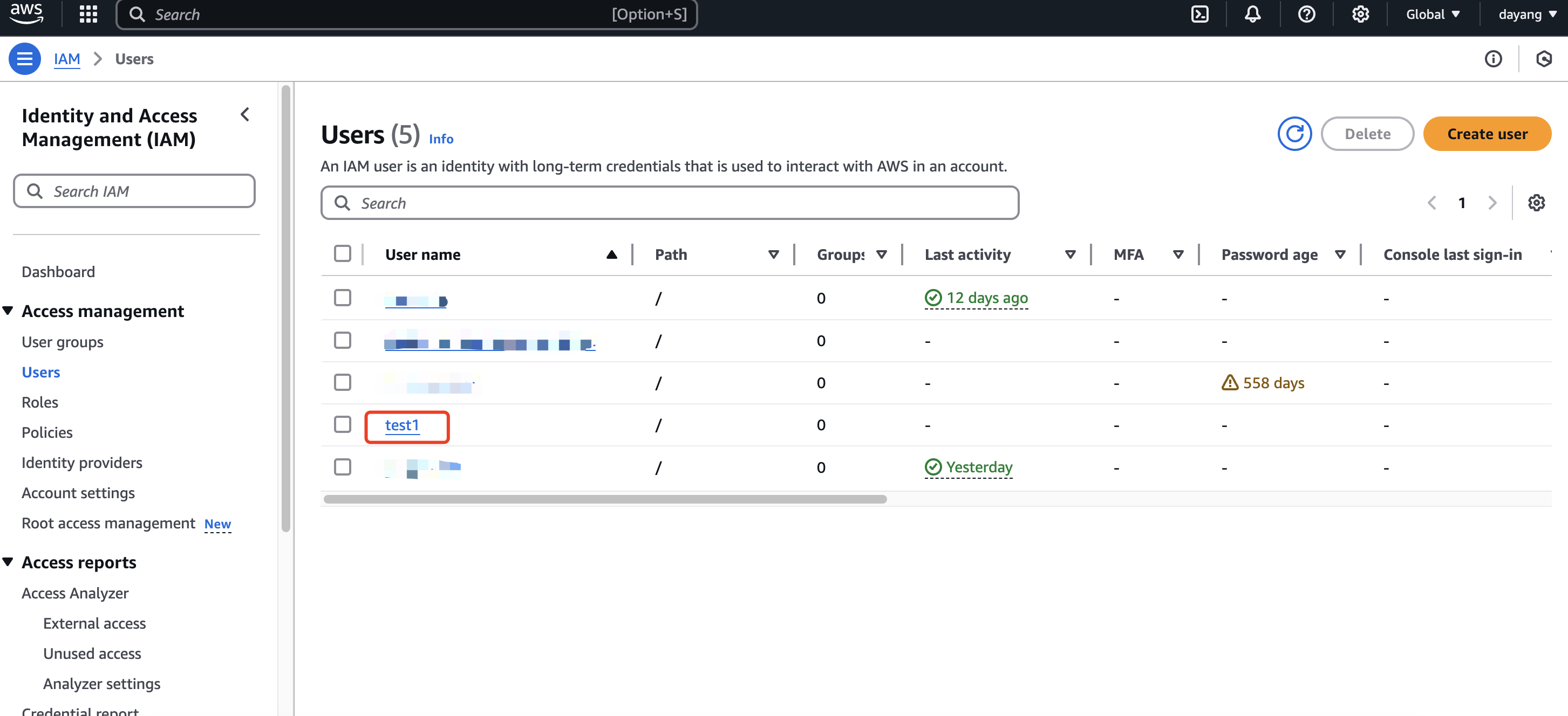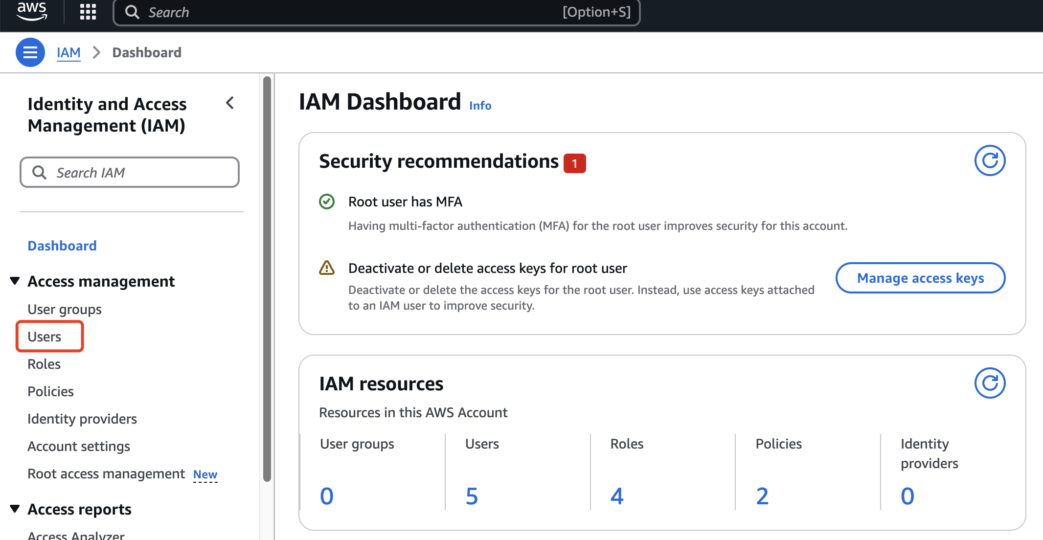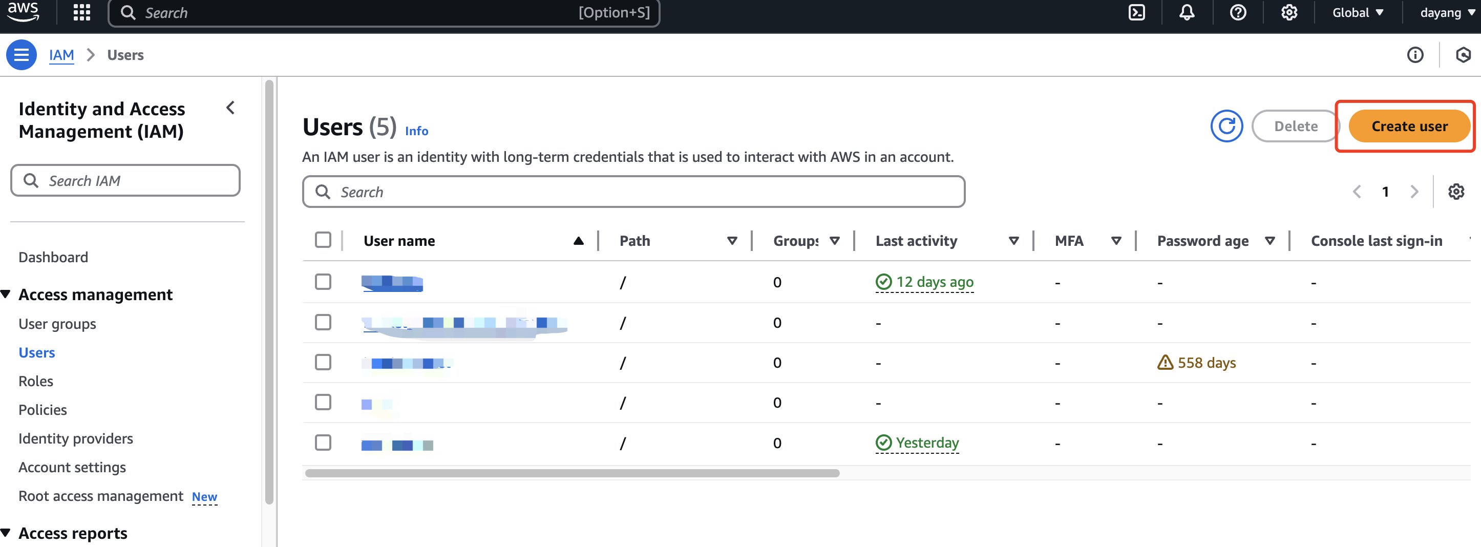 1. 登录 AWS 控制台,进入 Identity and Access Management (IAM) 界面,单击 Users,进入用户管理页面。