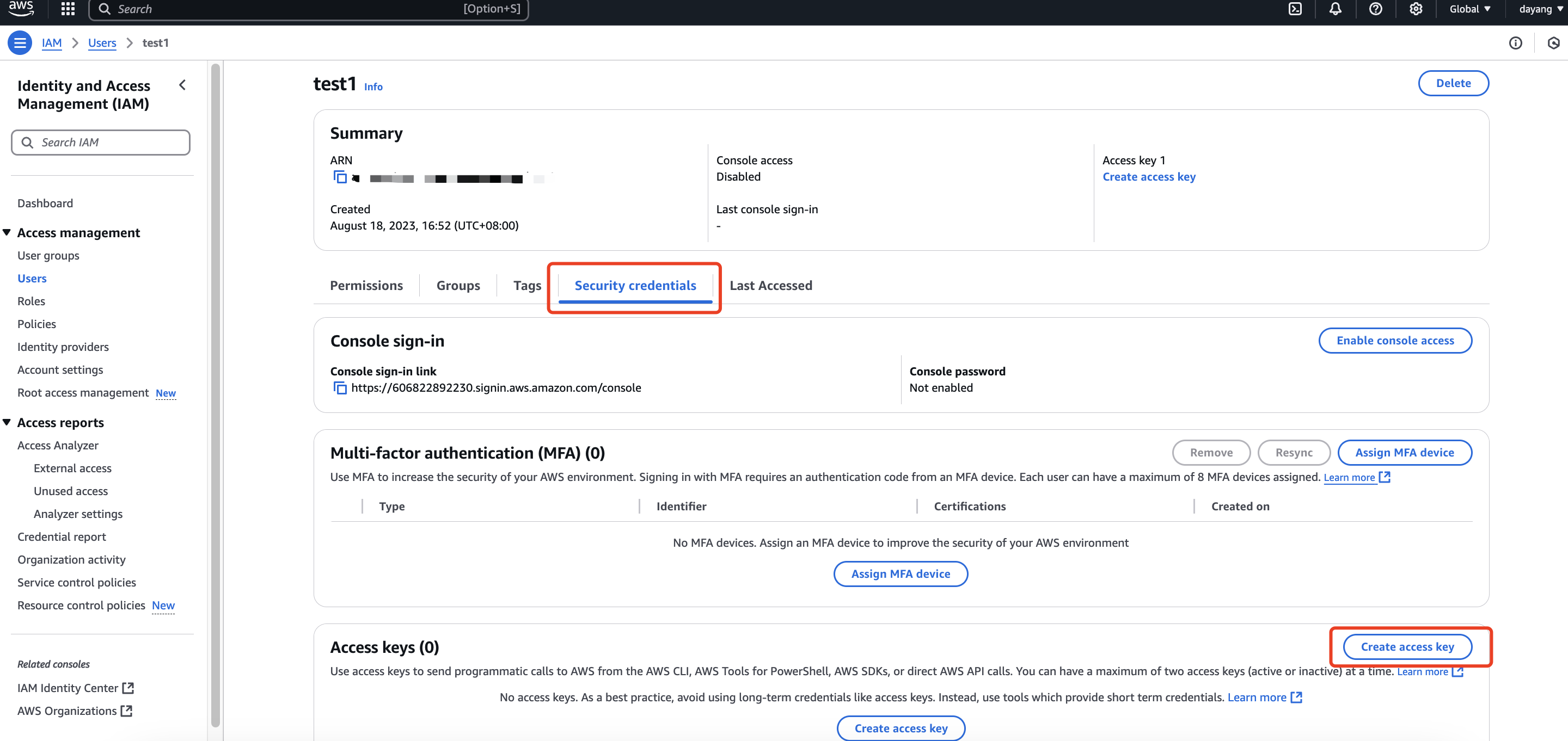 2. 选择 Security credentials > Access keys,然后单击 Create access key。
