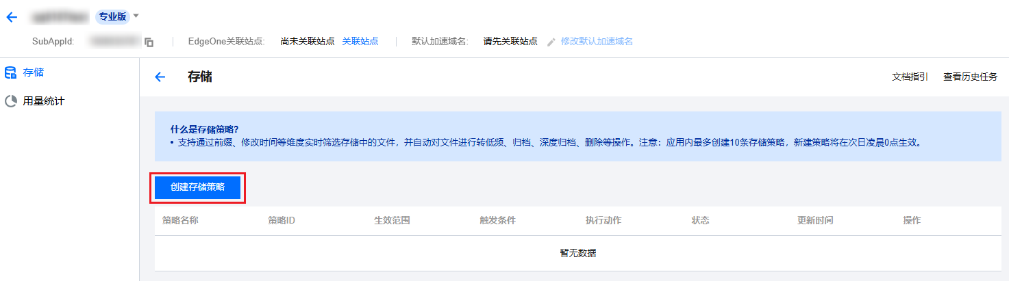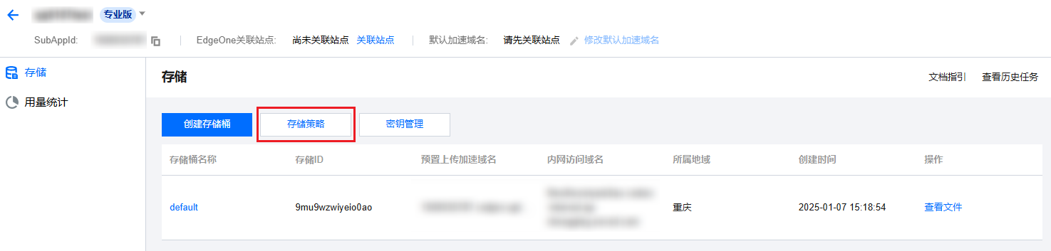 2. 找到需要配置存储策略的专业版应用,单击应用名称进入应用存储页面。单击存储策略,进入存储策略页面。