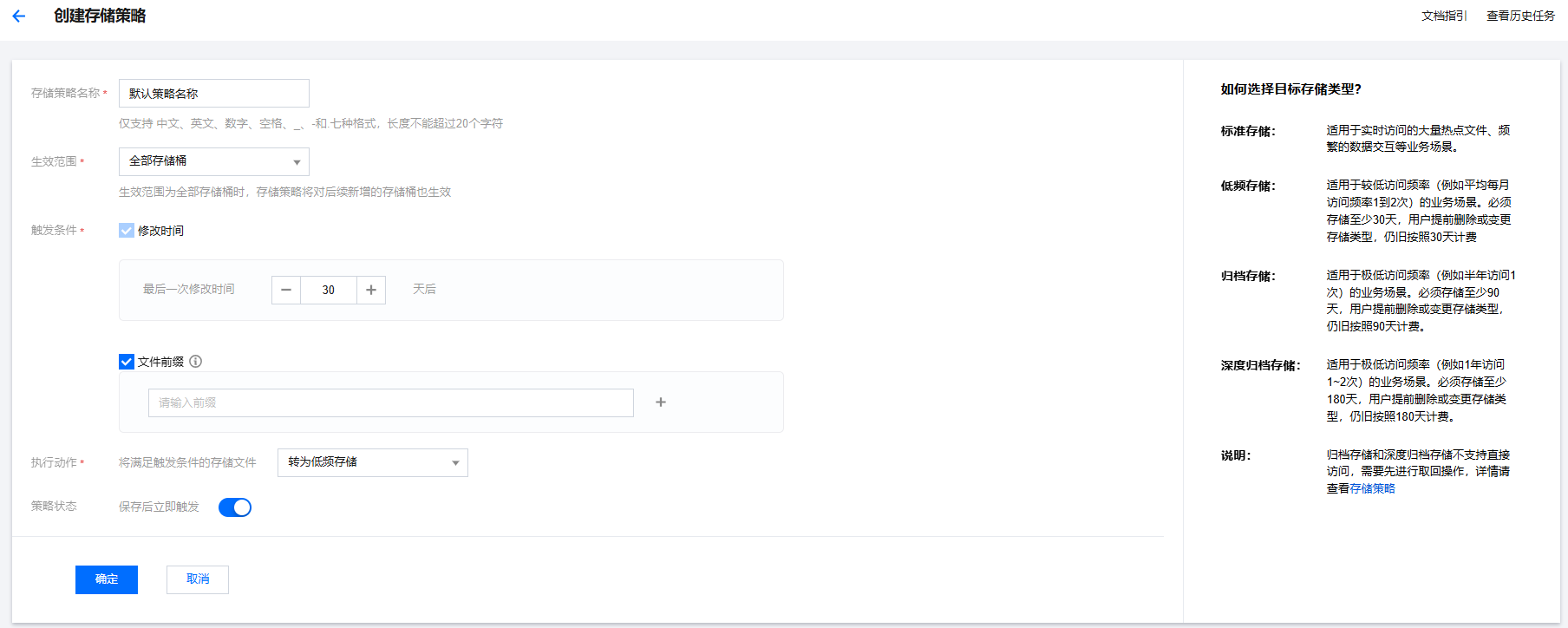 5. 策略详情配置完成后,单击确定完成存储策略的创建,存储策略将在次日凌晨0点正式生效。
