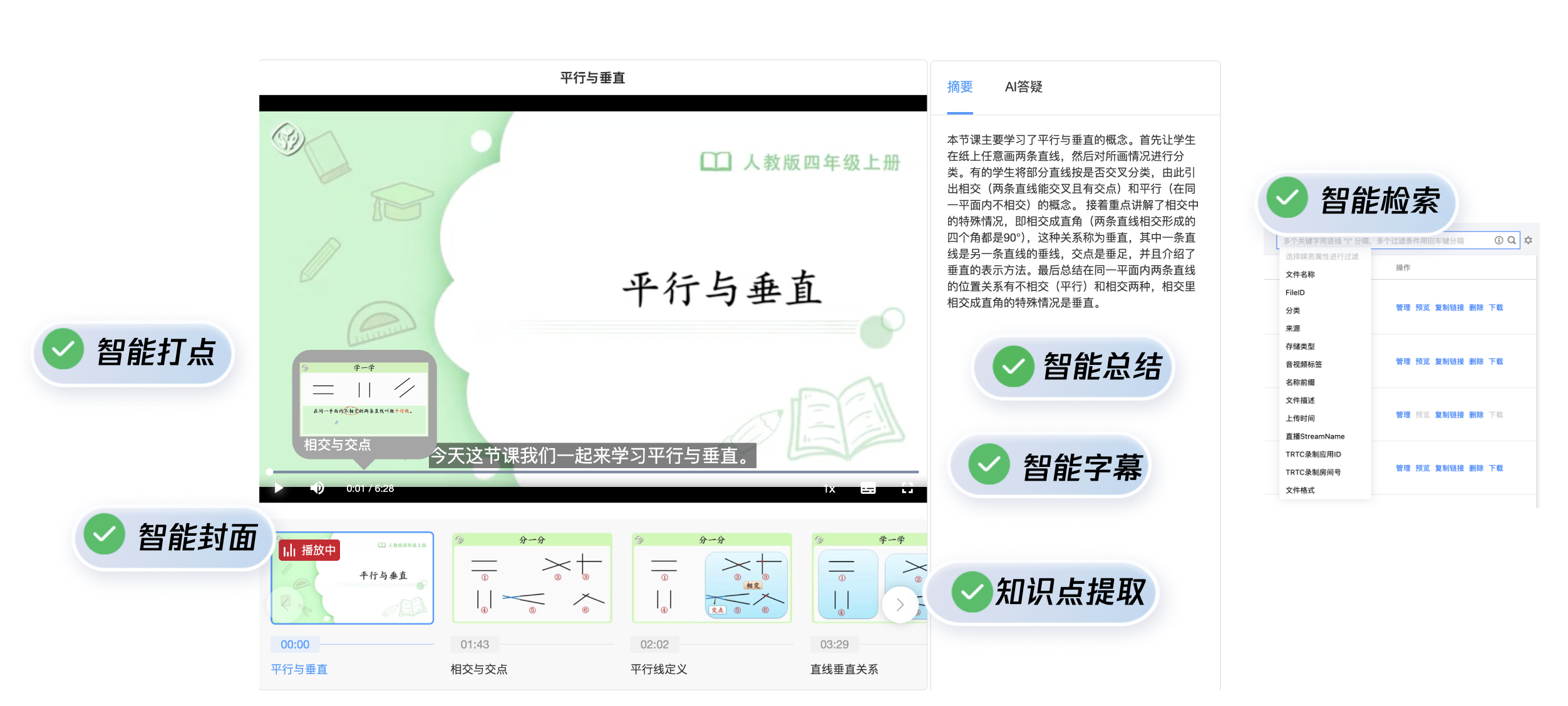 依托多模态 AI 技术实现媒资精细化管理,自动对音视频进行智能打标、内容解析与结构化编目,将非结构化素材转化为可高效检索的资产。支持自然语言跨模态秒级检索,精准定位目标片段,检索准确率可达80%以上。同时提供分级存储与智能降冷策略,结合 DRM 加密、HLS 私有化加密技术,在保障版权安全的前提下,最大化提升素材复用率,让沉淀的存量媒资持续创造商业价值。智能媒资当前处于产品内测阶段,如有需求请 联系我们。