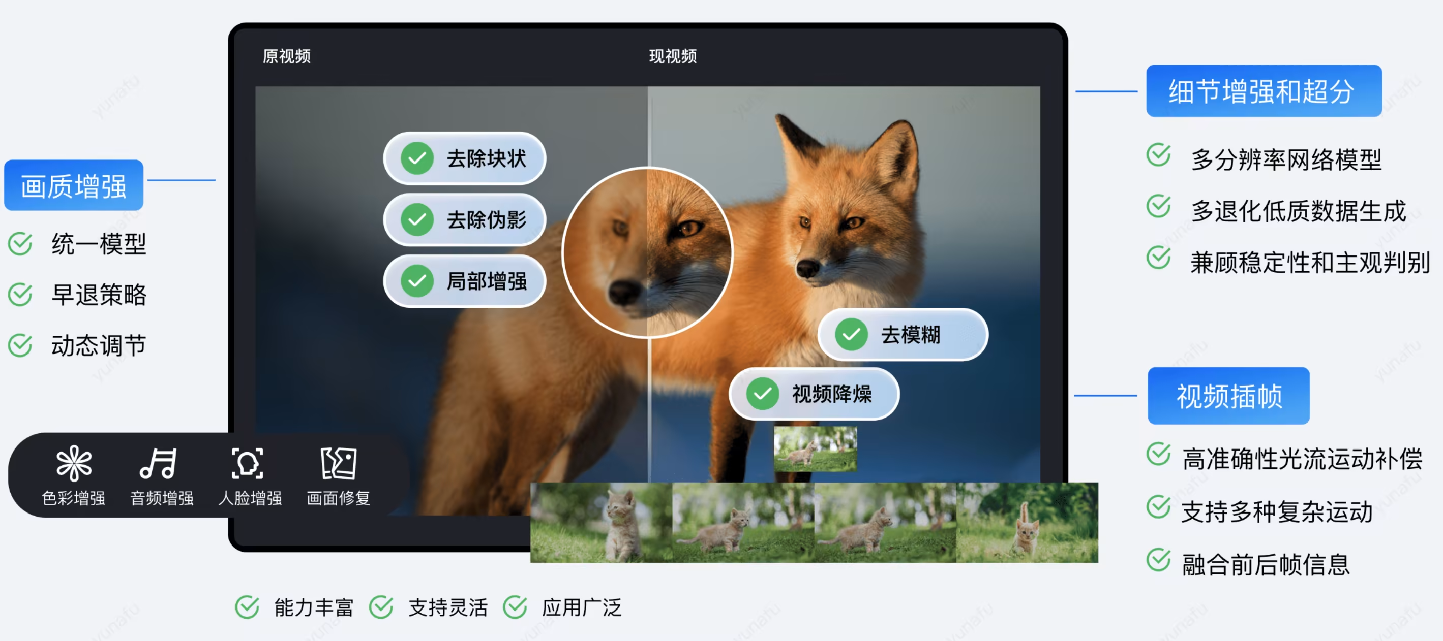 | 色彩增强 | 旨在改善视频的色彩表现,使画面更接近真实色彩,并在一定程度上进行增强以满足人眼的喜好。它通过调整色彩的饱和度、对比度和亮度,修复因采集设备或保存问题导致的色彩失真,从而提升视频的整体视觉效果。 |