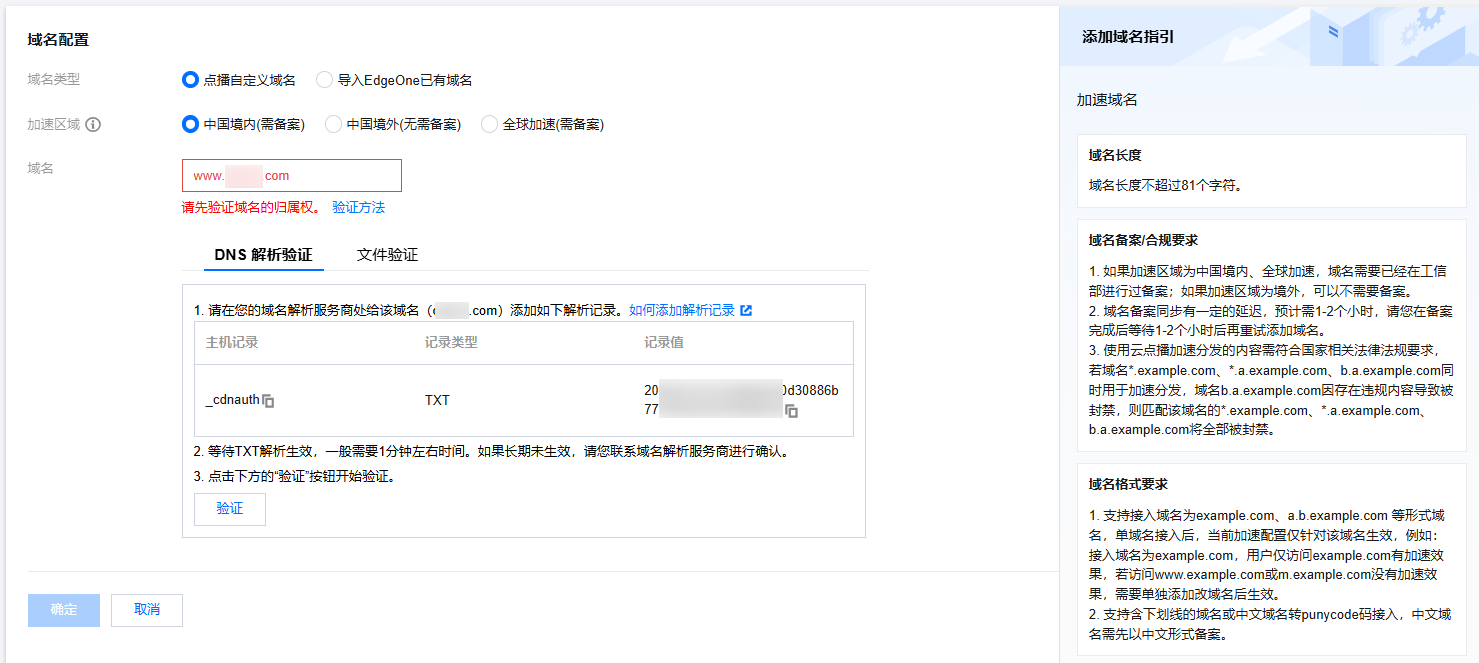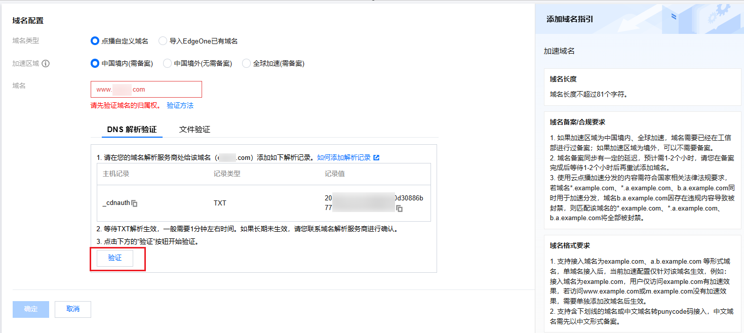 添加完解析记录后,等待 TXT 记录值生效,生效后,您可单击下方的验证,即可完成域名归属校验;如果验证失败,请确认当前 TXT 记录值在域名解析服务商内是否已生效或是否填写了正确的 TXT 记录值。检测 TXT 记录是否生效可以参见此 说明。