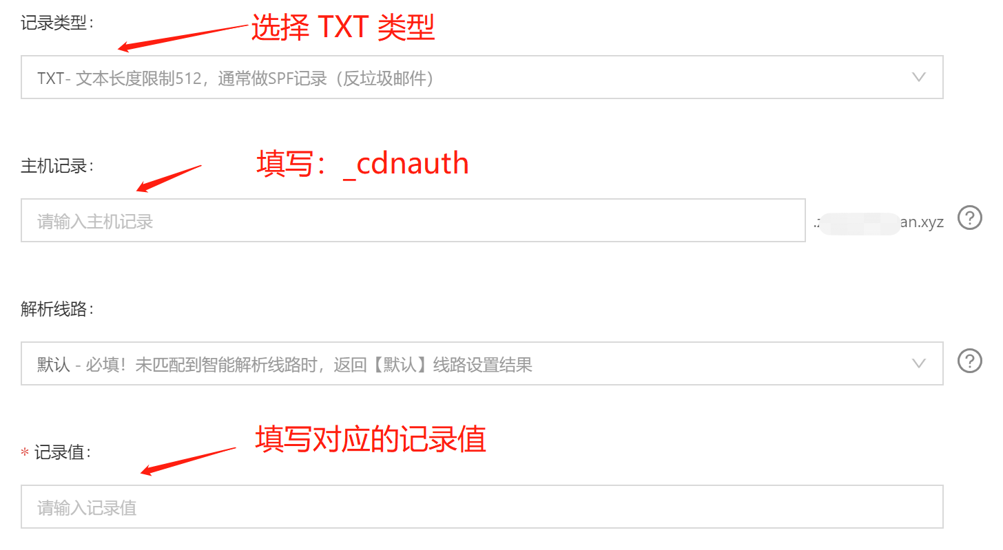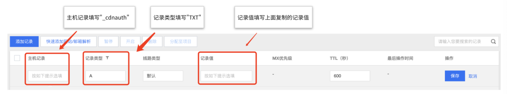 _cdnauth,记录类型选择为 TXT,记录值填写为腾讯云 CDN 提供的记录值,其余选项按照默认参数填写即可。