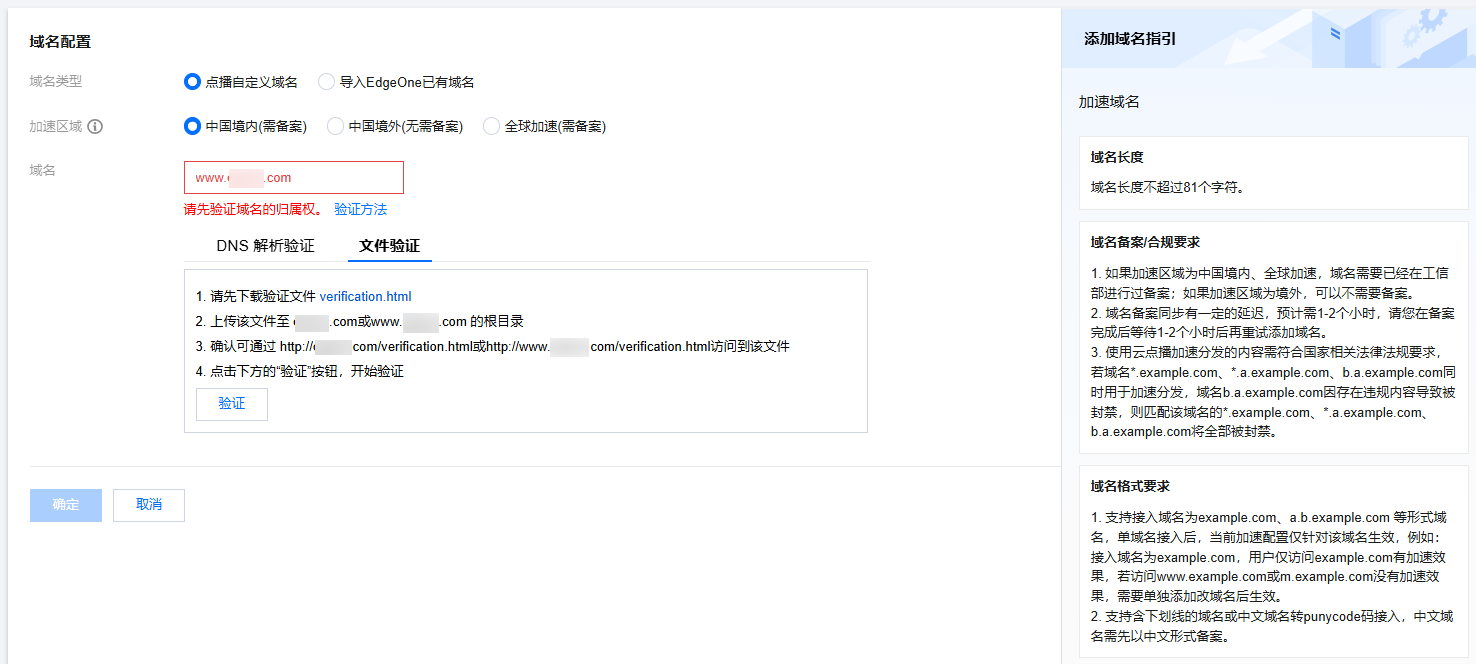 http(https)://加速域名/verification.html 访问到验证文件。单击验证,即可通过验证。三、解析域名