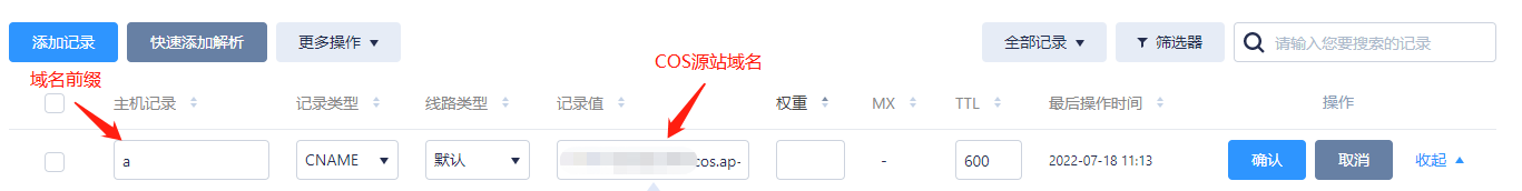 2. 在加速域名的 解析 处增加一条 CNAME 记录,将其指向 COS 源站域名。