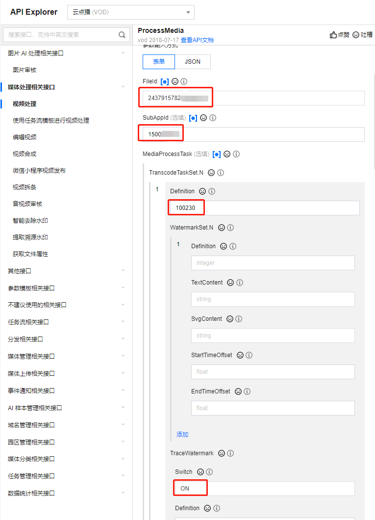 1. 请参见视频处理的 接口文档,通过 API Explorer 发起转自适应码流任务。其中: