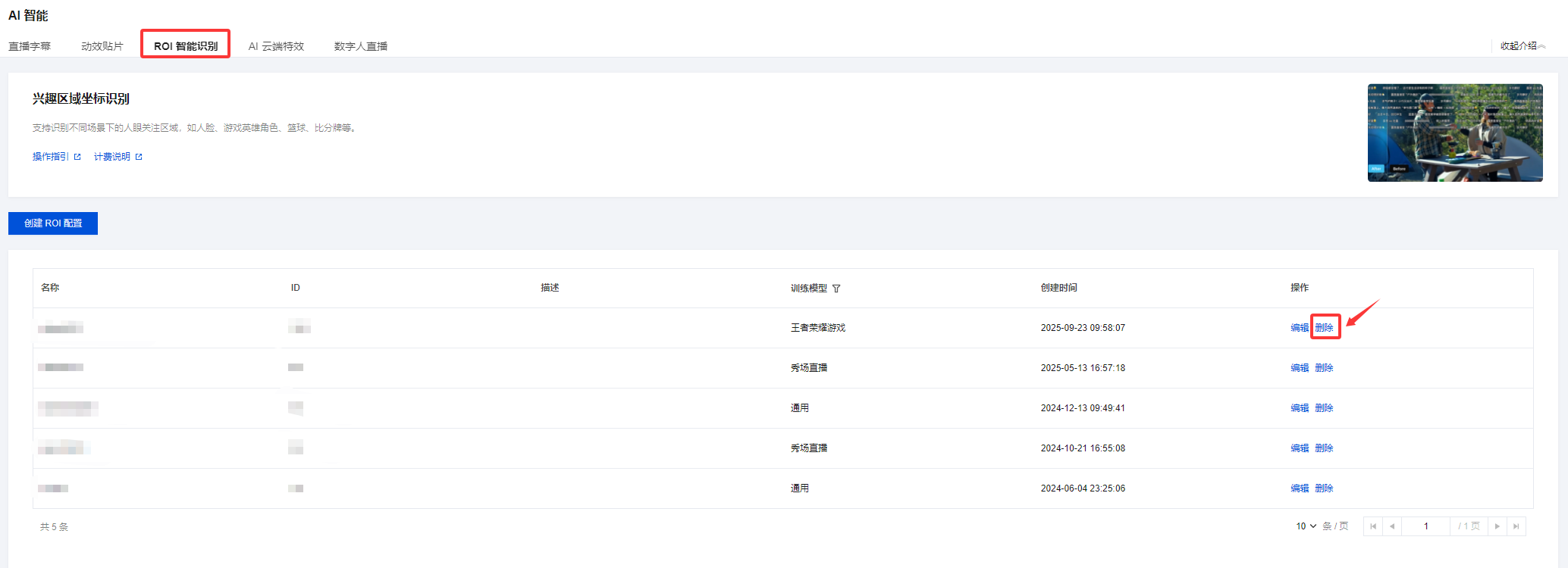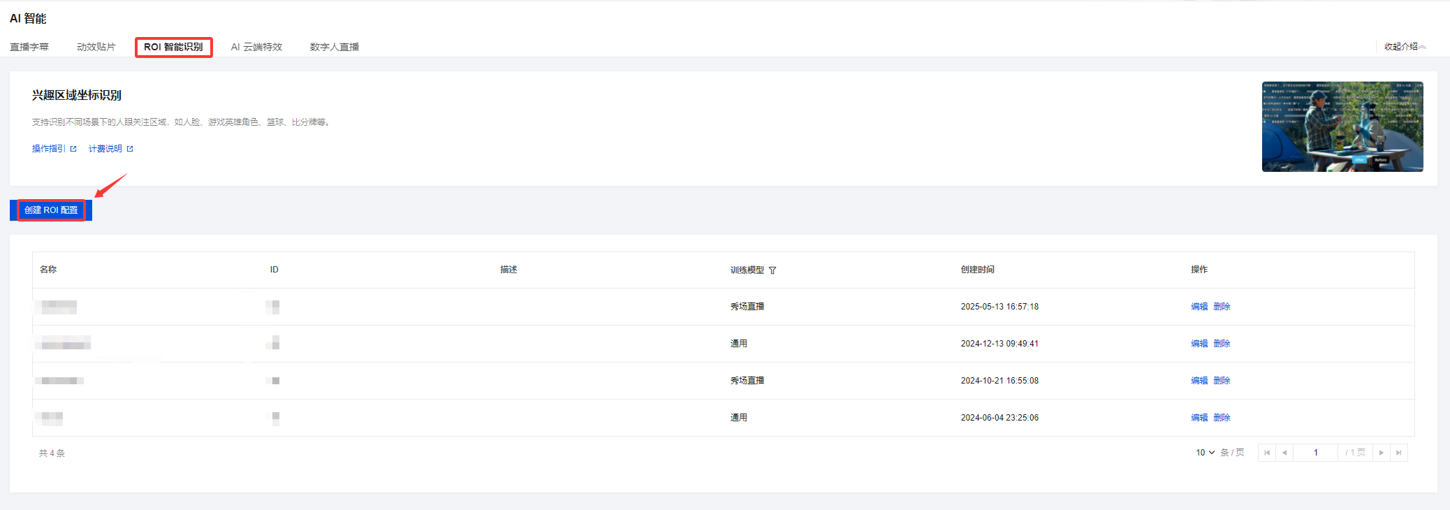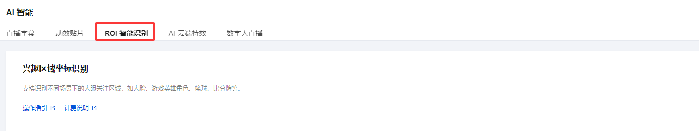1. 登录 云直播控制台,选择功能配置 > AI 智能 > ROI 智能识别。