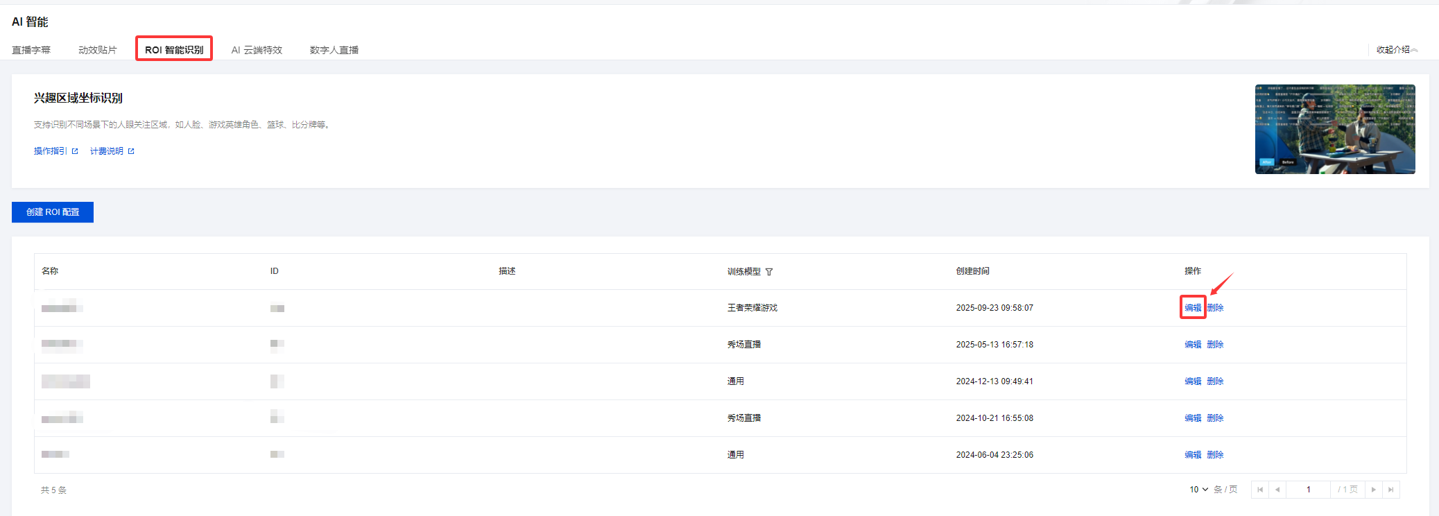 2. 选择您已创建成功的 ROI 配置模板,并单击右侧的编辑,即可进入修改模板信息。