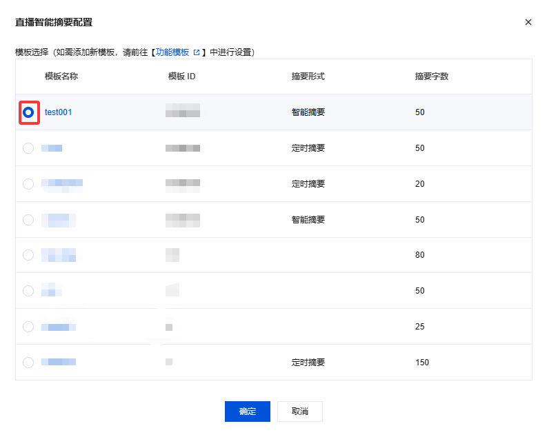 3. 根据您的业务需求选择智能摘要配置模板,然后单击确定即可完成配置。