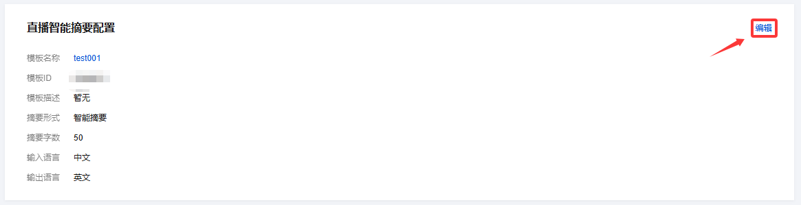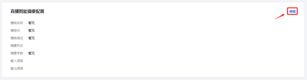 2. 选择模板配置页签,单击直播智能摘要配置标签右上角的编辑。