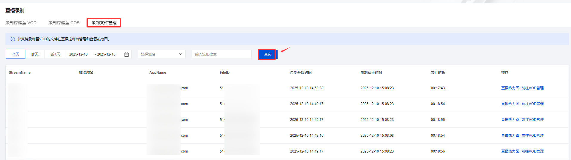 云直播控制台,进入功能配置 > 直播录制 页面。2. 在直播录制中选择录制文件管理。可以通过录制时间、推流域名和流ID筛选录制文件。单击查询可查询最近7天的数据。