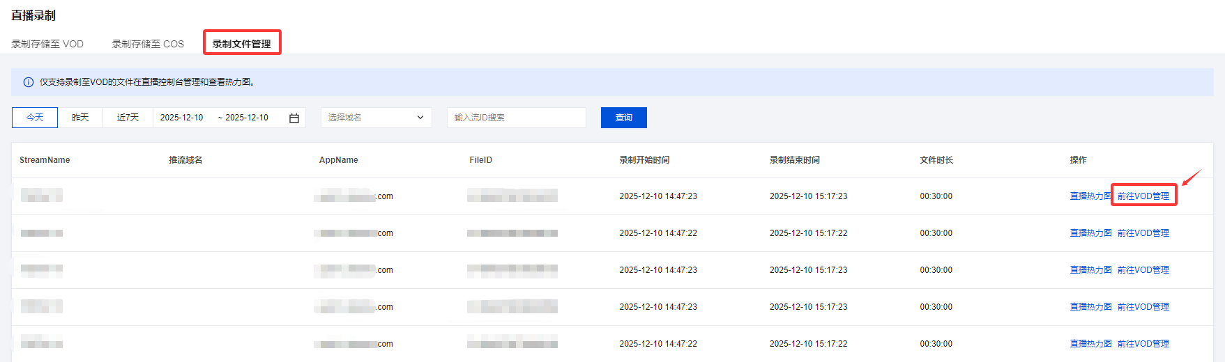 云直播控制台,进入功能配置 > 直播录制 页面。2. 在直播录制中选择录制文件管理。单击操作列中的前往VOD管理,会进入 云点播控制台 页面。