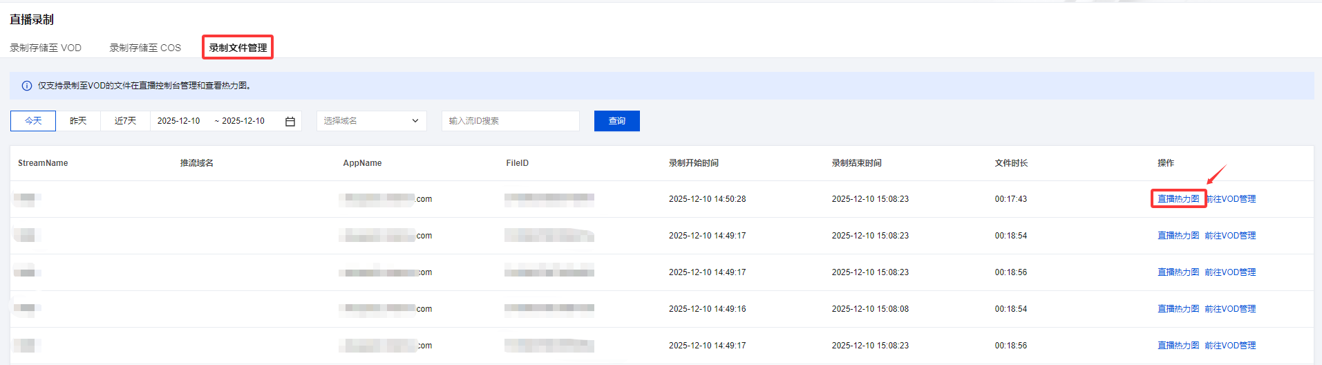 云直播控制台,进入功能配置 > 直播录制 页面。2. 在直播录制中选择录制文件管理。单击操作列中的直播热力图,可查看录制文件和直播热力图预览。