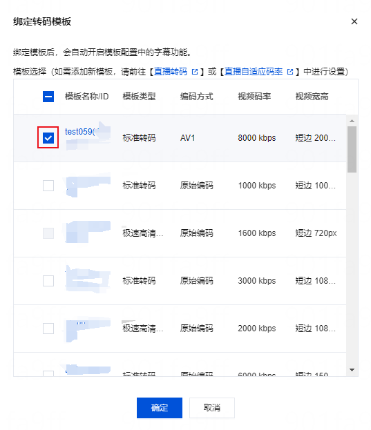 2.1.2 您可以根据实际业务需求,选择转码模板或自适应码率模板,单击确定即可。