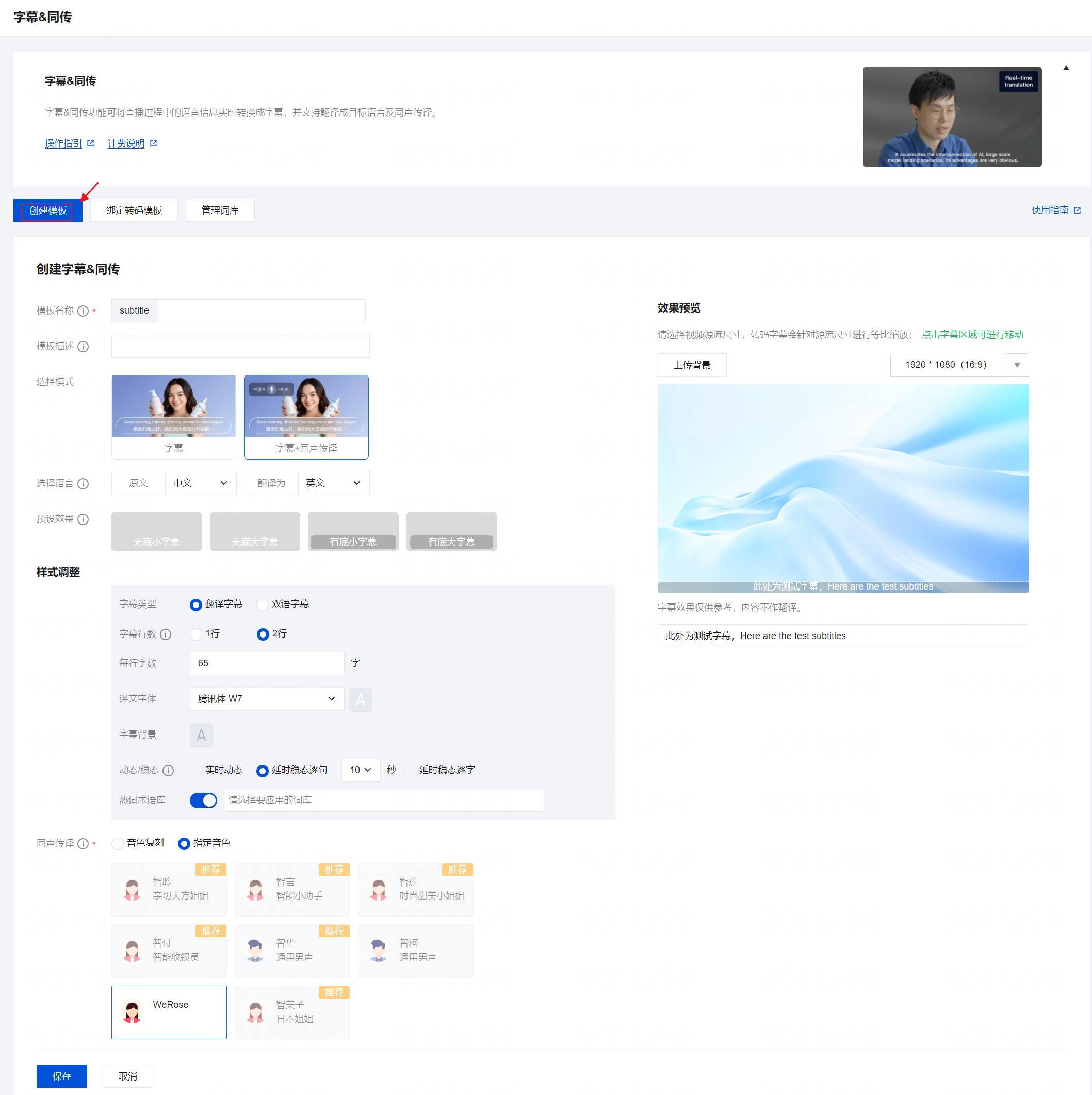 5. 单击创建模板,进入字幕&同传创建页,进行如下配置: