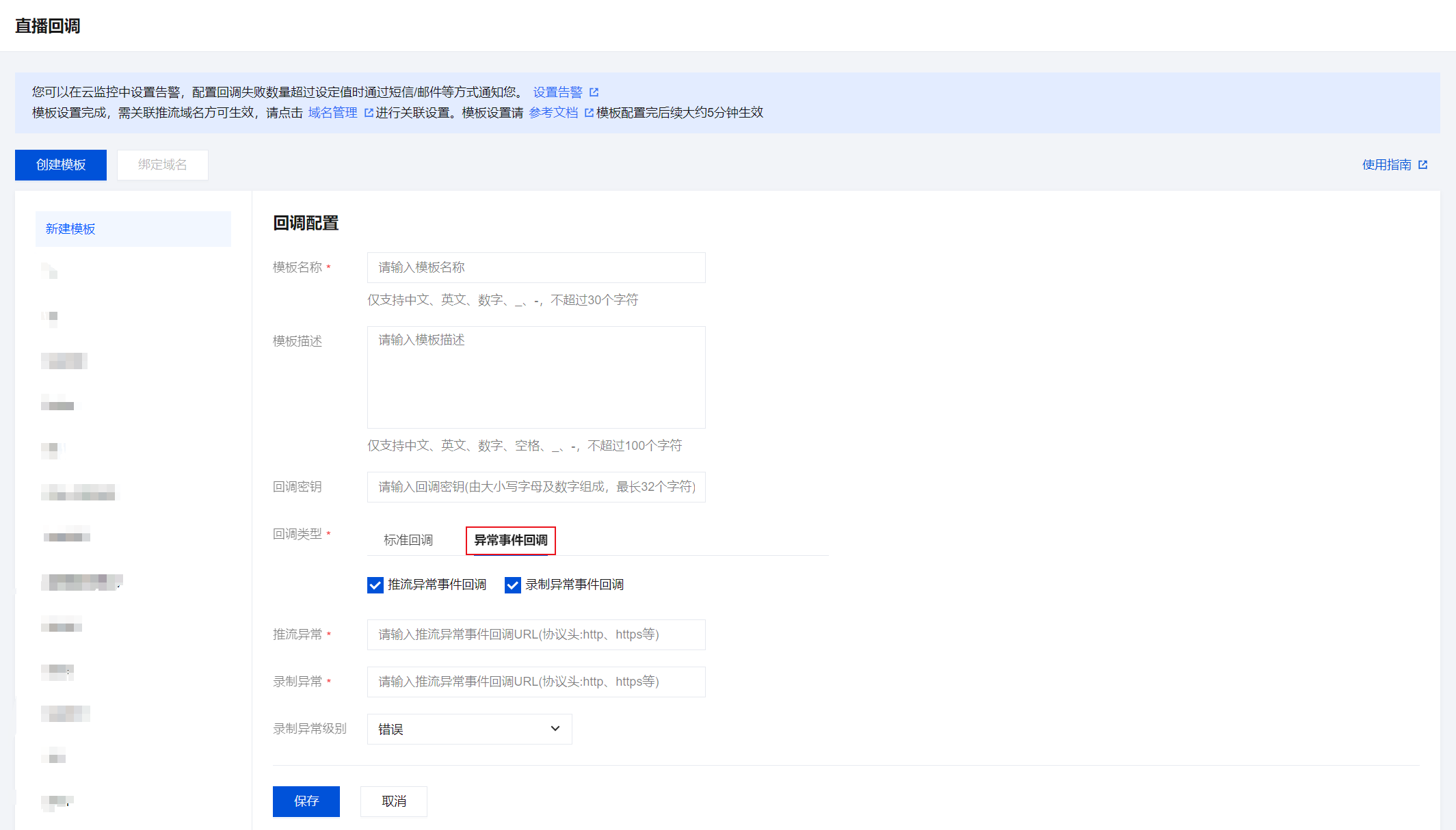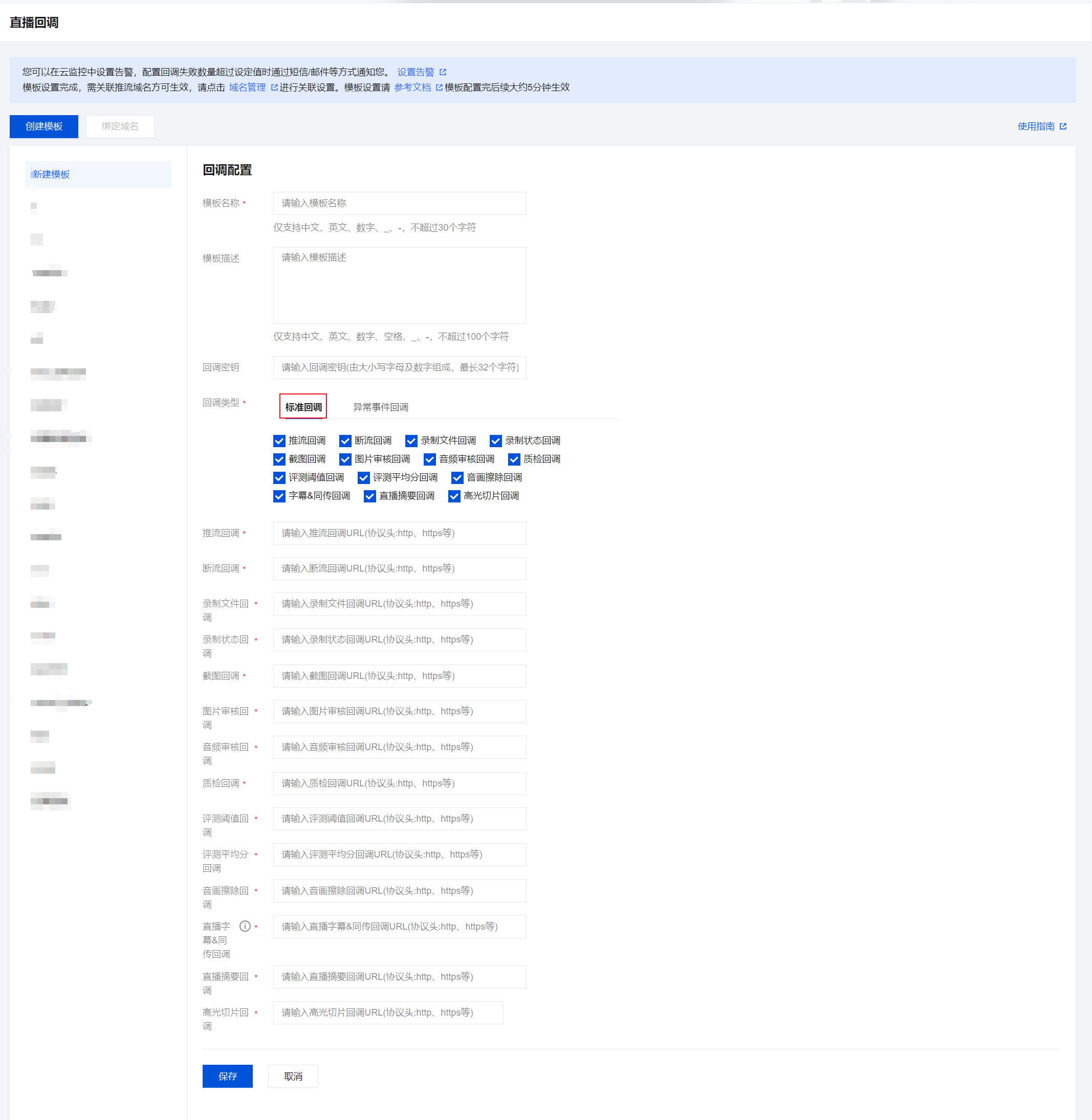3. 单击创建模板,在直播回调新建模板中填写回调信息,选择回调类型并填写回调地址,可多选。单击保存即可。