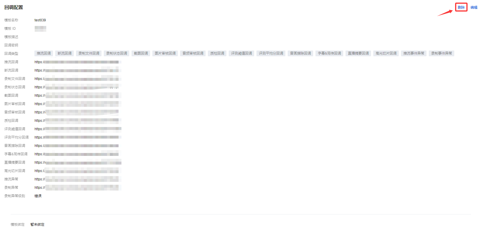 2. 选择您已创建成功的回调模板,单击右侧的删除。