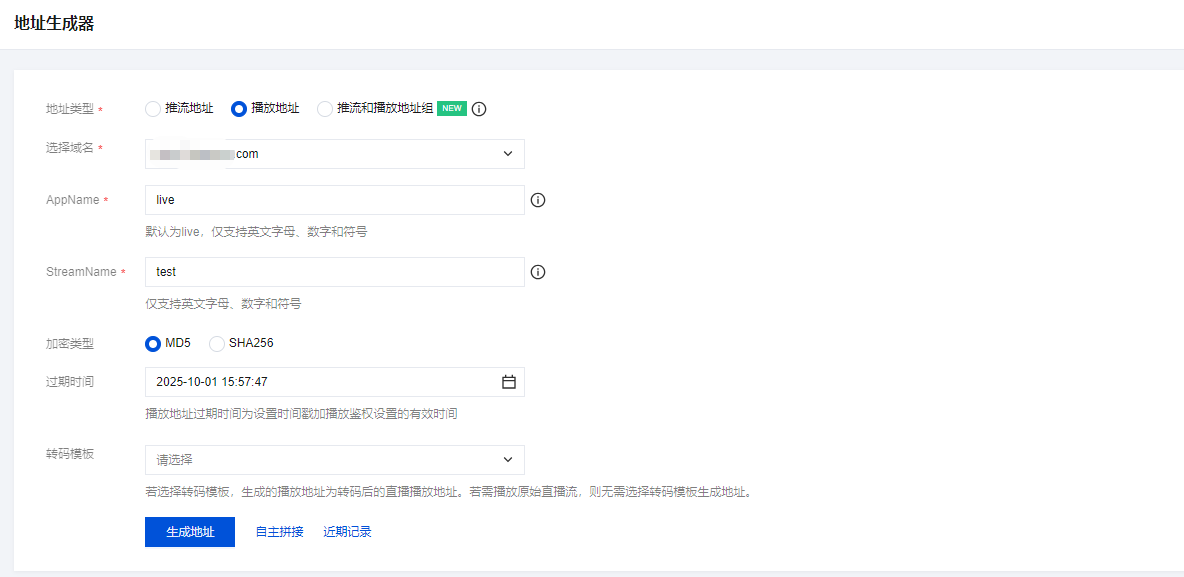 2025-10-01 15:57:47。若选择转码模板,生成的播放地址为转码后的直播播放地址,若需要播放原始直播流,则无需选择转码模板生成地址。
